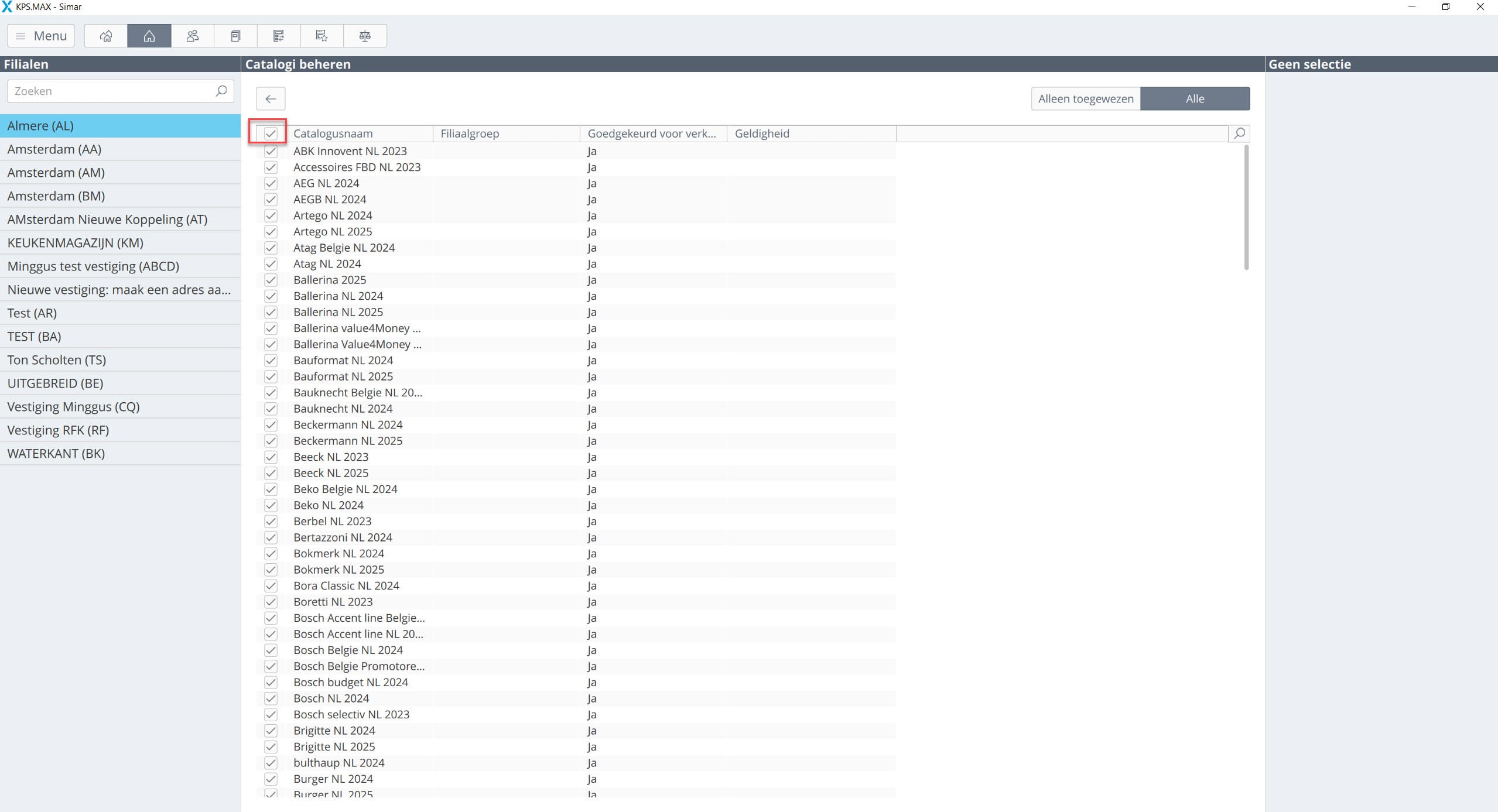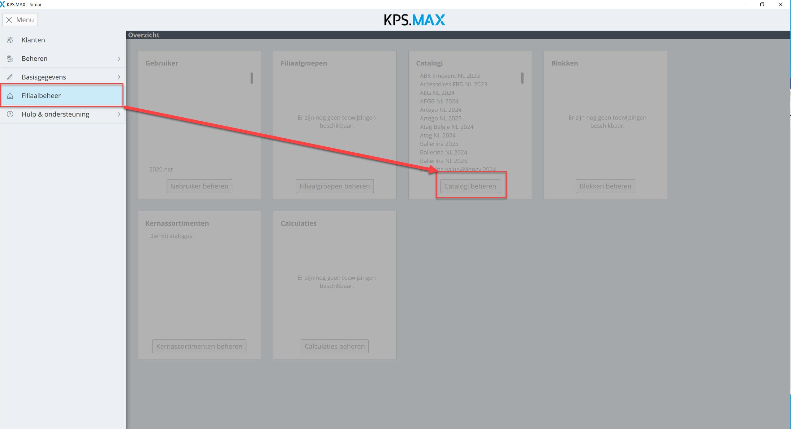 - Ga naar ‘Catalogi beheren’. Schakel de catalogi in die beschikbaar zouden moeten zijn voor het betreffende filiaal.
