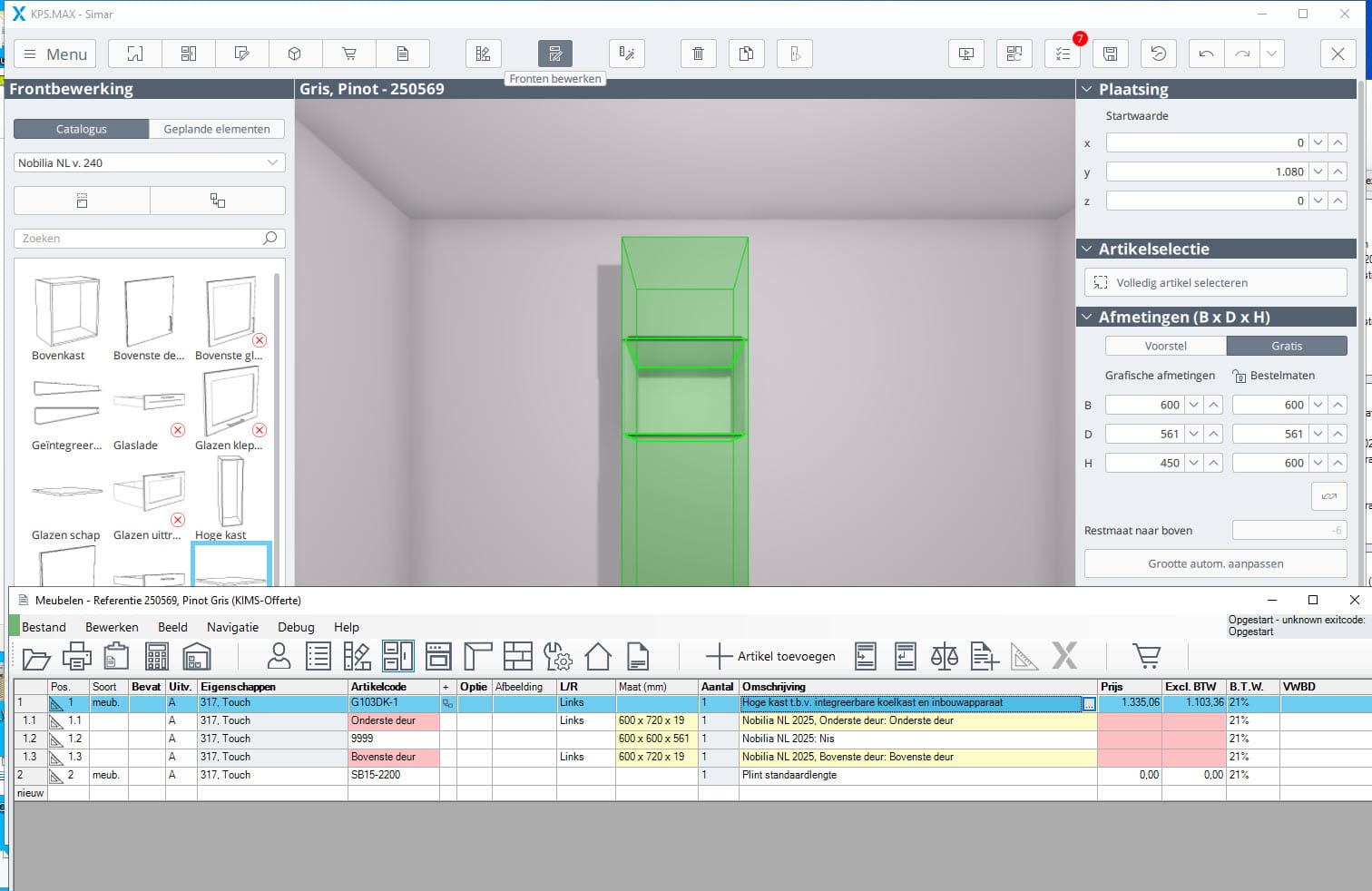 Hoe komt het dat een kast in de offerte is opgedeeld in losse onderdelen? En nog belangrijker, hoe lost u dit op! Het opdelen van kasten in de afzonderlijke componenten wordt veroorzaakt door de functie ‘Fronten bewerken’ in KPS.MAX. Zodra u deze functie gebruikt, wordt een kast opgedeeld in losse onderdelen, deze onderdelen worden gesynchroniseerd met uw offerte, maar hebben geen prijsinformatie en worden dus rood weergegeven.